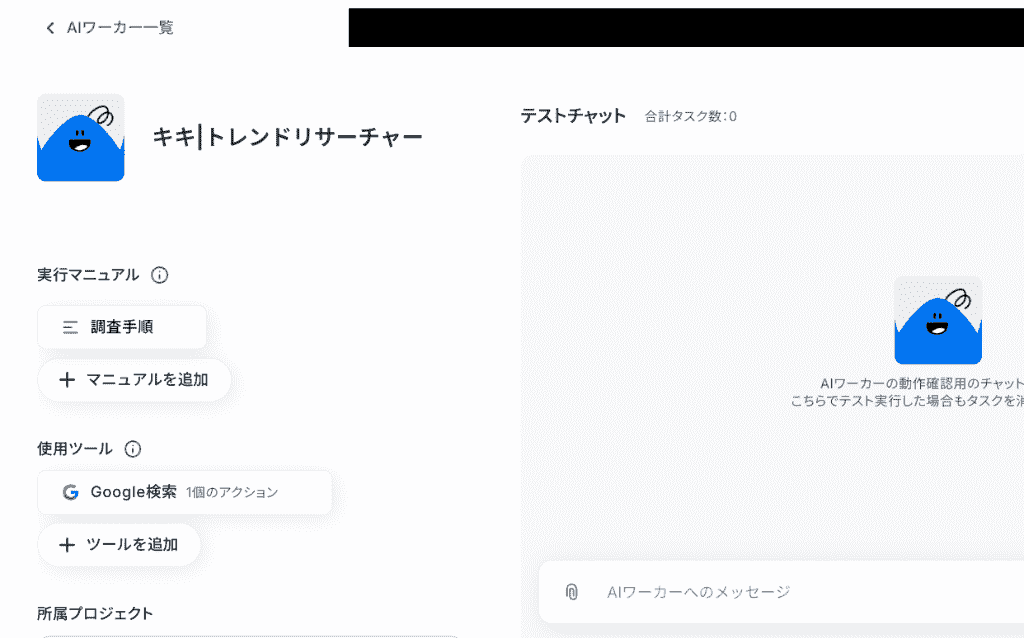さあ、いよいよ作成したAIワーカーに対してチャットで指示を送信します。