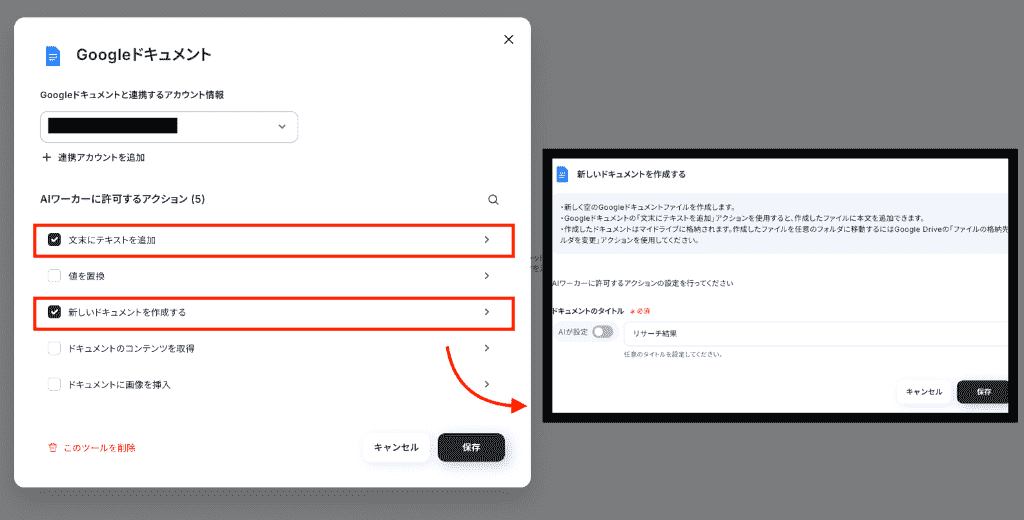 私はすでにアカウントを連携しているため、このまま「AIワーカーに許可するアクション」を設定していきます。