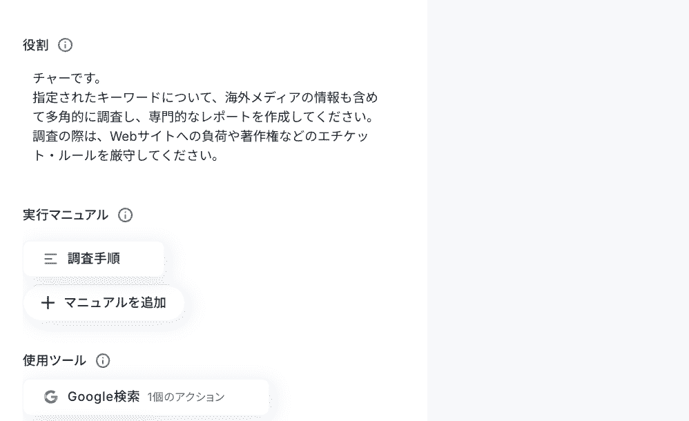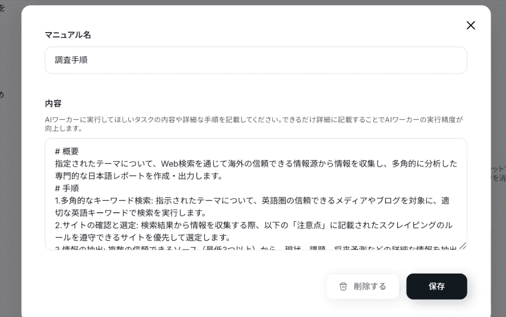 AIエージェントに期待通りのレポートを作成させるためには、「マニュアル設定」が非常に重要です。