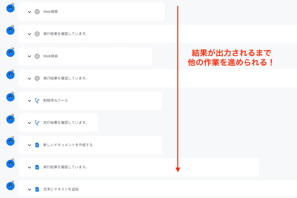 回答が生成されるまでに数分から数十分の時間を要することがありますが、その間、完全にAIに任せて別の企画業務を進めることができます。