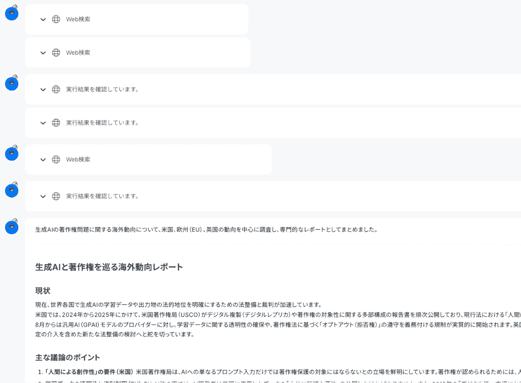 通常の検索では日本語の二次情報しか得られないような専門的なテーマでも、AIワーカーなら言語の壁を越えて英語圏の一次情報に直接アクセスし、高品質なリサーチを行ってくれるんです!