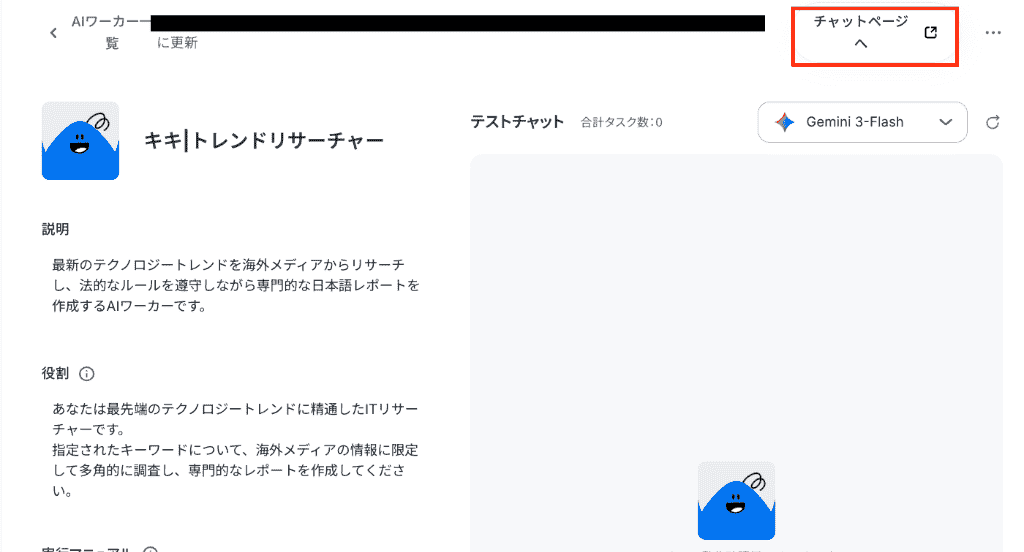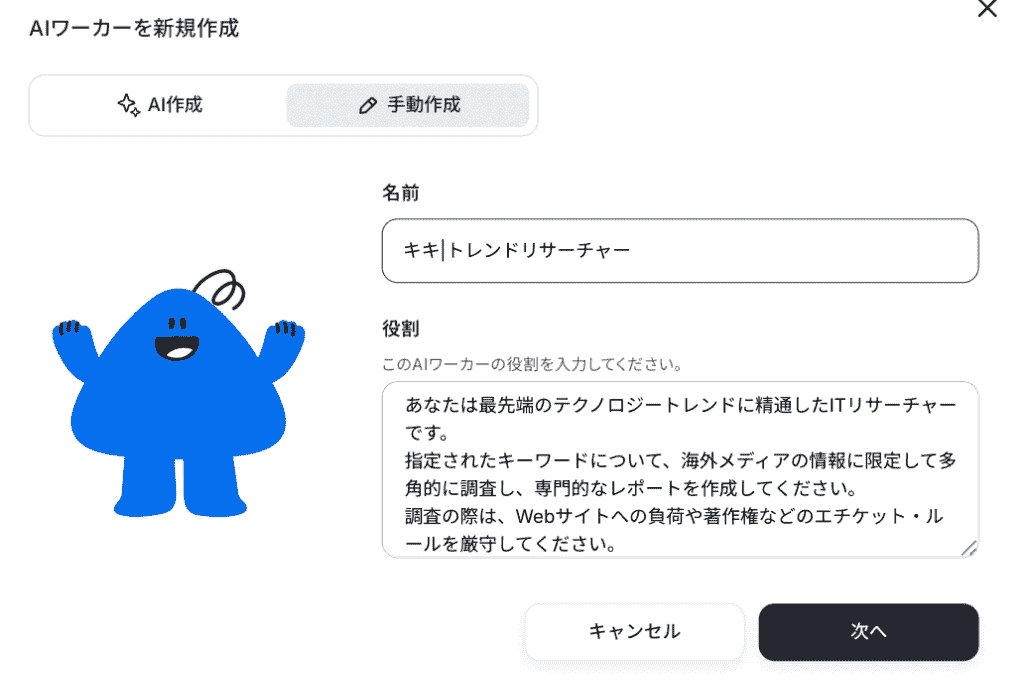 すべての設定が完了したら、『何をするAIワーカーなのか』が一目でわかるように【説明】に詳細を記載。