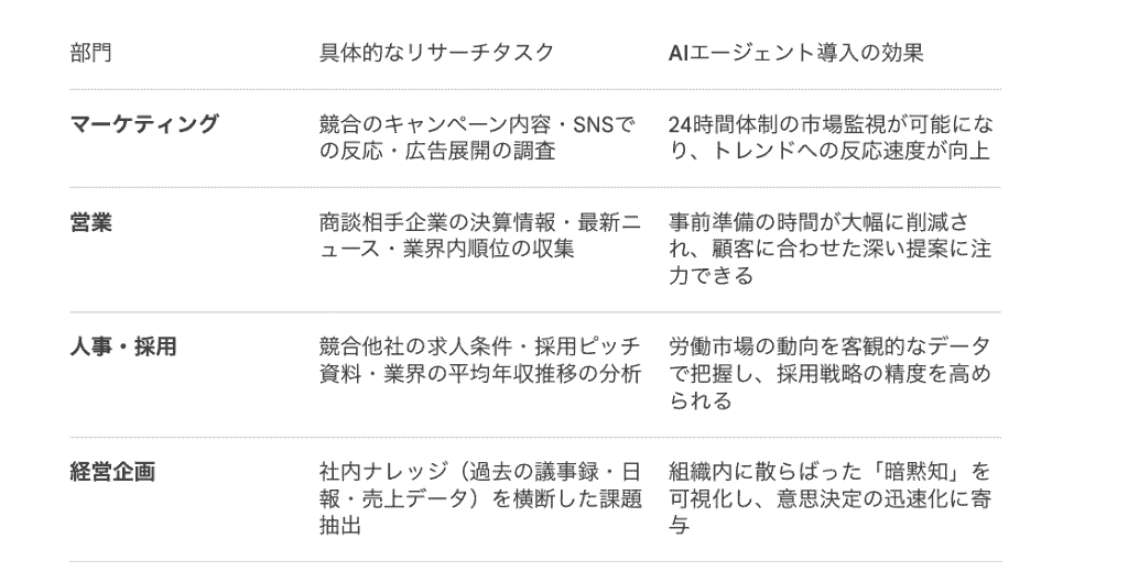 AIエージェントによるリサーチ自動化は、すでに幅広い分野で実用化が始まっています。