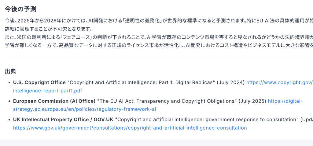 出力結果には参照したすべてのソース(URL)が明記されるため、情報のファクトチェックも容易に行えます。