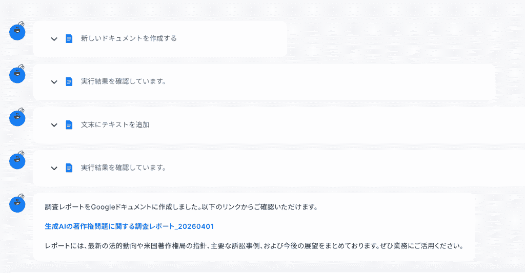 今回作ってみたトレンド調査を行うAIエージェントは、Google検索でリサーチした後に情報をGoogleドキュメントにまとめてくれるものです!