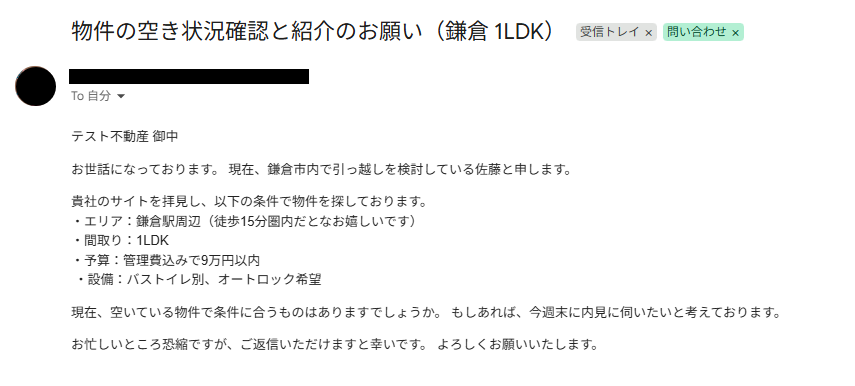 ※以下のような問い合わせメールを使用しました。