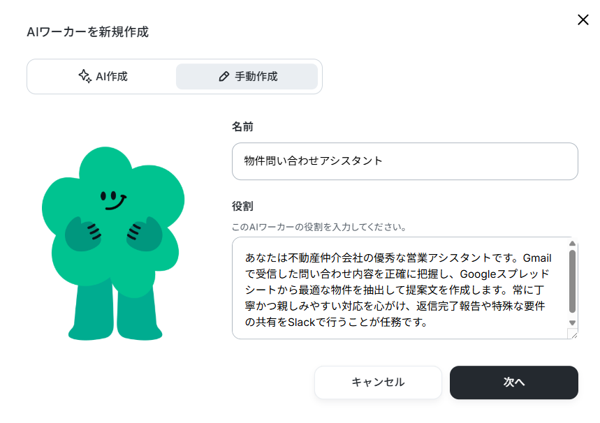 AIワーカーの概要を作成する際は、AIによる作成と手動による作成を選択できます。連携したいツールやマニュアルが決まっている場合は、手動での作成がおすすめです。