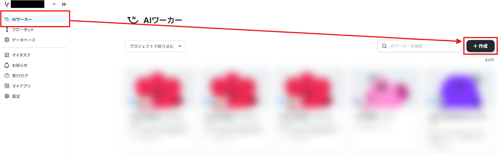 まずは左側のメニューから「AIワーカー」を選択し、「作成」をクリックしましょう。