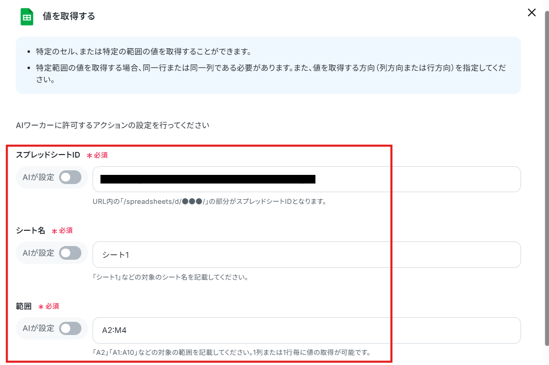 アクションの右側の「>」をクリックすると、各項目をAIワーカーに任せるか、手動で入力するかを設定できます。