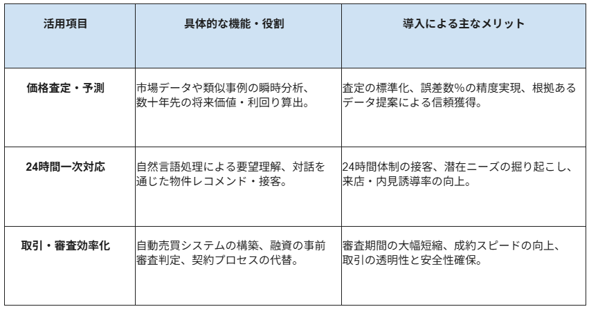 さらに、バックオフィス業務でも、融資審査の即時判定や自動売買システムの構築が進んでおり、成約までのリードタイムを短縮しています。これら一連のプロセスにAIを組み込むことで、業務の標準化と顧客体験の向上が同時に達成されます。