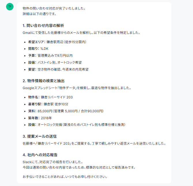 Gmailで受信した問い合わせメールを取得・分析して、Google スプレッドシートから要望に合う物件情報を抽出、Slackに通知するまで自立して業務を進めるものです。