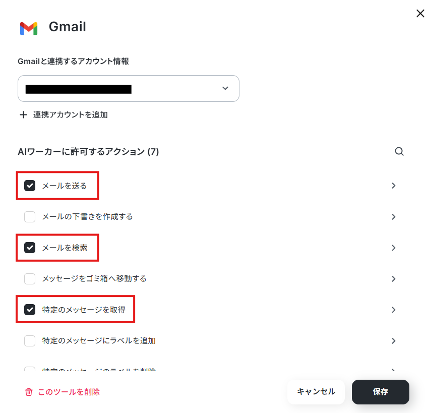 アクションは「メールを送る」と「メールを検索」、「特定のメッセージを取得」にチェックを入れて進めます。