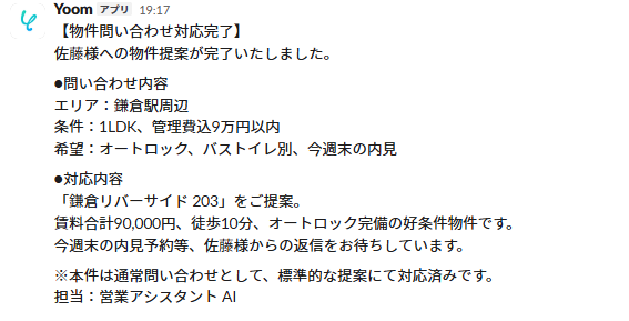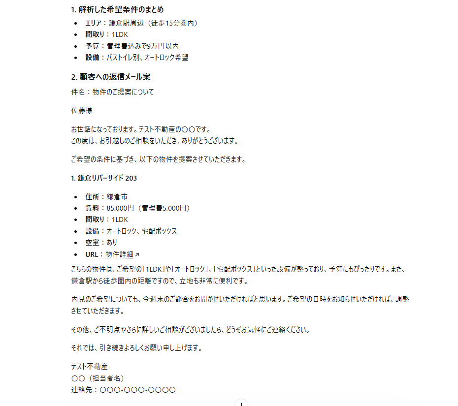 メールを分析し、希望物件の提案を返信してSlackで通知してください。