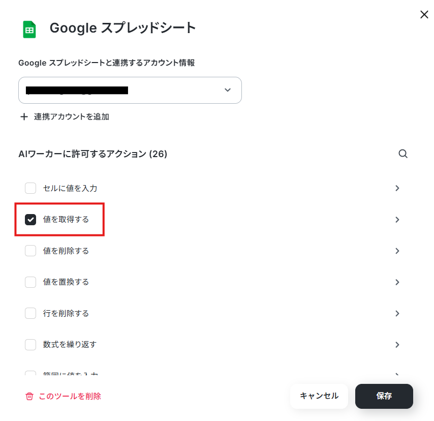 連携するアカウント情報を設定したら、「値を取得する」「レコードを取得する」にチェックを入れます。