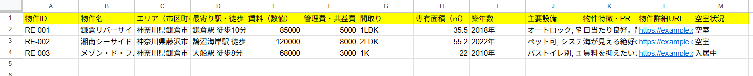 - RE-003: メゾン・ド・フルール 102 / 鎌倉市 / 68,000円(管理費3,000円) / 1K / バストイレ別、エアコン / 入居中 / https://example.com/003