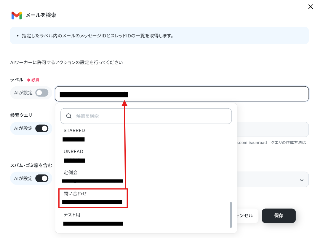 今回は、「メールを検索」のラベルを設定しています。入力欄をクリックすると候補が表示されるので、その中から選びましょう。