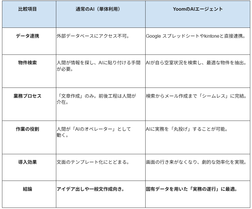 通常のAIとYoomのAIエージェントを比較した結果、実務における効率性の差が浮き彫りとなりました。