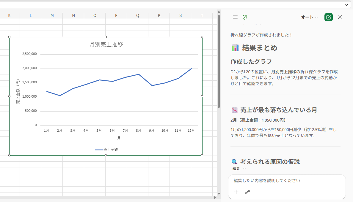 検証結果 :プロンプト送信後、短時間でExcel上にグラフが挿入され、データに基づいた論理的な分析テキストが表示 されました。 データの列を具体的に指定し、分析結果だけでなく改善案までセットで要求するプロンプトにしたことで、単なるグラフ作成にとどまらない深い洞察をワンステップで得ることができました。