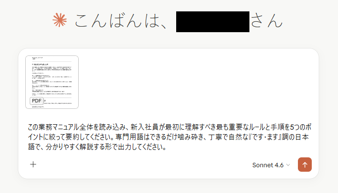 検証④【Claude】数万文字のPDF資料を自然な日本語で要約 Claudeの長文処理能力 と日本語の自然さ を検証するため、およそ3万文字に及ぶ専門的な業務マニュアルのPDFファイルをアップロードし、要約の作成を依頼しました。