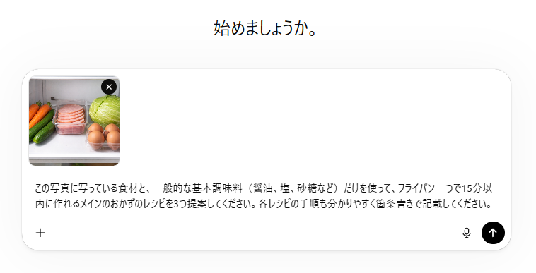 検証①【ChatGPT】画像認識で冷蔵庫の残り物からレシピ提案 ChatGPTの高いマルチモーダル(画像やテキストの複合処理)能力 を活かし、日常の料理の悩みを解決する検証を行いました。 冷蔵庫の中にある残り物の野菜や調味料をスマートフォンで撮影し、その画像をそのままChatGPTにアップロードして献立を考えてもらいました。