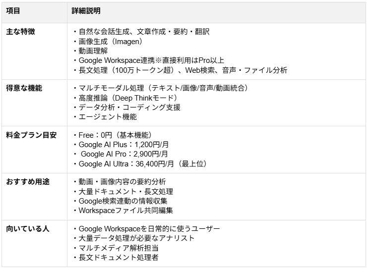 ▼Gemini(Google) Googleが提供するGeminiは、Googleの検索エンジンと密接に連動し、根拠に基づいた情報収集 に長けています。大規模な情報を一度に処理できる構造を持っており、長大な資料の解析においても高いパフォーマンスを発揮します。 料金体系は、標準的な機能を提供する無料プラン のほか、「Google AI Plus」 や「Google AI Pro」 などの有料プランが用意されています。このプランは、Google Workspaceアプリ群との連携に加え、大容量のクラウドストレージが付属する形態をとっています。また、より高度な処理能力や動画生成機能を含む上位の「Google AI Ultra」 という選択肢も存在し、用途に応じた使い分けが可能です。