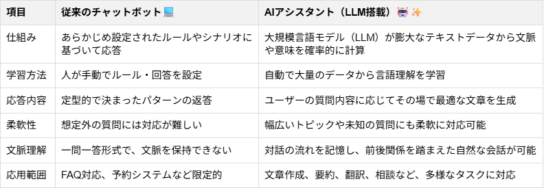 ▶従来のチャットボットとの違い 従来のチャットボットは、あらかじめ設定されたルールに沿って定型的な返答を行うもの でした。そのため、想定外の質問には対応できず、柔軟な対話が難しいという課題がありました。 一方、AIアシスタントは、大規模言語モデル(LLM) という高度な仕組みを基盤としています。インターネット上の膨大なテキストデータを学習し、単語と単語の関連性や文脈を確率的に計算することで、ユーザーの自由な質問に対してその場で最適な文章を生成 します。
