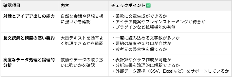 2.自身の目的に合った得意分野の確認 AIアシスタントにはそれぞれ強みとする分野があり、目的に応じて使い分けることで最大の効果を発揮します。ツールごとに得意とする処理能力を見極める ことが選び方のポイントです。