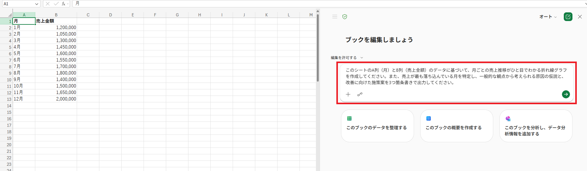 このシートのA列(月)とB列(売上金額)のデータに基づいて、月ごとの売上推移がひと目でわかる折れ線グラフを作成してください。 また、売上が最も落ち込んでいる月を特定し、一般的な観点から考えられる原因の仮説と、改善に向けた施策案を3つ箇条書きで出力してください。