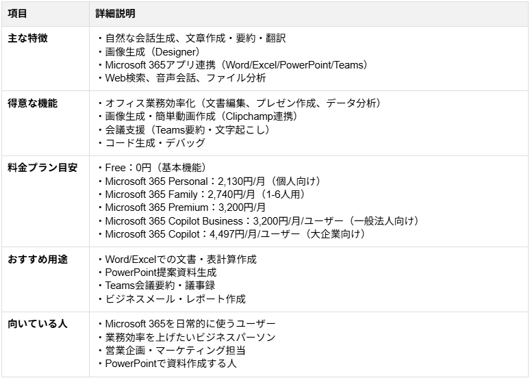 ▼Microsoft Copilot Microsoft Copilotは、WordやExcel、PowerPointといったOffice製品と直接統合されている点 が最大の特徴です。アプリの操作画面から直接指示を出し、文書の構成案作成やデータの視覚化を行えるため、事務作業の効率化において独自の利便性を持っています。個人でOfficeアプリ内のCopilot機能を利用するには、Microsoft 365 Premiumの契約が必要となります。 法人向けにはMicrosoft 365 Copilotなど別プランが提供されているため、導入時には個人利用か法人利用かに応じて適切なプランを確認することが重要です。