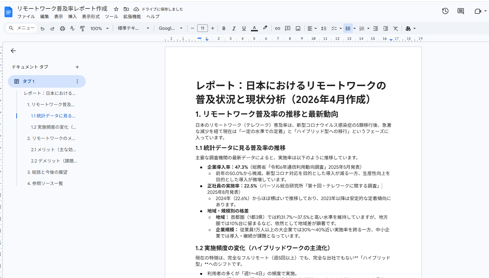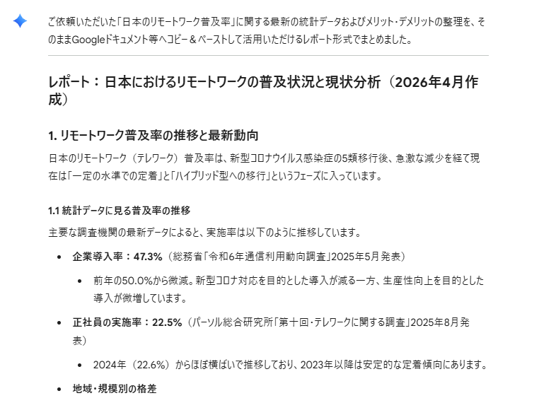 日本のリモートワーク普及率に関する直近の調査結果や統計データを検索し、その推移と主なメリット・デメリットを整理して、レポート形式でまとめてください。 その際、必ず参照した情報のソース(元の調査機関名など)を明記してください。 また、この結果をそのままGoogleドキュメントにエクスポートできるように構成してください。