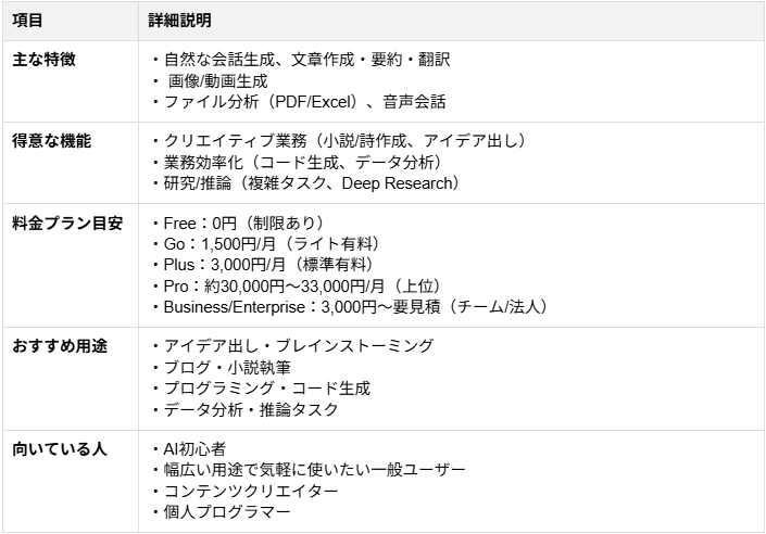 ▼ChatGPT(OpenAI) OpenAIが提供するChatGPTは、汎用性と拡張性に優れたAIアシスタント です。 論理的思考に特化した推論モデルが搭載されており、思考プロセスを組み立てながら回答を生成する特徴により、複雑な問題解決を可能にしています。 料金プランは、多機能な無料版 に加え、標準的な「ChatGPT Plus」 が用意されています。さらに、特定の機能に絞って手頃な価格で提供される「ChatGPT Go」 や、利用制限を排して優先的な処理能力を提供する「ChatGPT Pro」 など、使用頻度や専門性の高さに合わせた複数の選択肢が設けられています。