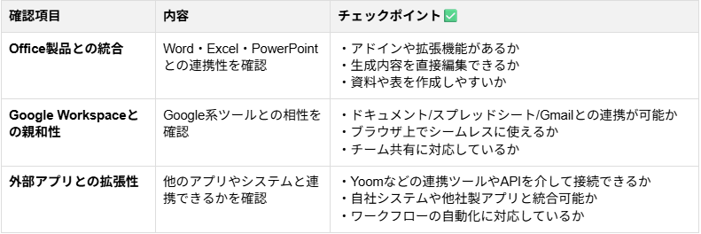 3.普段使っているツールとの連携のしやすさ AIアシスタントを業務フローに組み込む際、すでに日常的に使用しているソフトウェアとの相性 は見逃せないポイントです。連携のしやすさが作業効率に直結します。