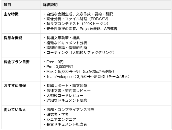▼Claude(Anthropic) Anthropicが提供するClaudeは、人間味のある自然な文章生成と、膨大なテキストを正確に読み解く長文処理能力 に定評があります。文脈を損なうことなく要約や分析を行う安定した性能が維持されています。また、文章作成にとどまらず、指示に基づいてコンピュータ上の操作を支援する機能や、ブラウザ内でプログラムを実行・検証できる環境も備わっています。 有料の「Claude Pro」 プランでは、Claude CodeやResearchなどの追加機能と、より多くの利用枠が提供されています。また、さらに高い利用上限や優先アクセスを必要とするユーザー向けに、上位の「Claude Max」 も用意されています。