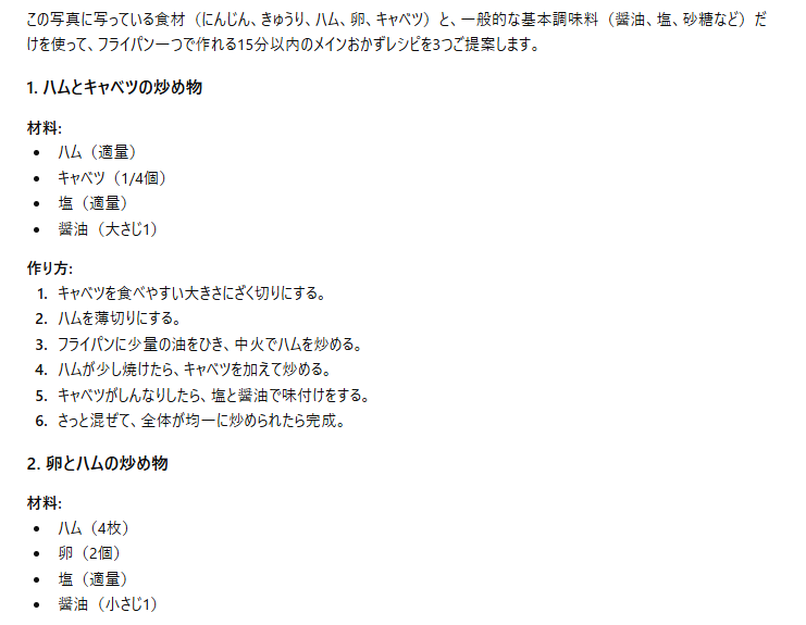 検証結果 :画像内の食材を概ね正しく認識し、指定した条件に沿った手軽なレシピを提案 してくれました。調理器具や時間の制約といった具体的な条件をプロンプトに盛り込むことで、実用的ですぐに実践できる回答を引き出すことができました。