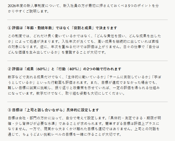 検証結果 :Claudeは途中で処理が止まることなく全編を正確に読み込み、指定したトーンと構成で非常に自然な日本語の要約を作成 しました。 ターゲット層(新入社員)や出力の語調をプロンプトで明確に指定することで、手直しがほとんど不要なレベルの社内共有用テキストが短時間で完成しました。