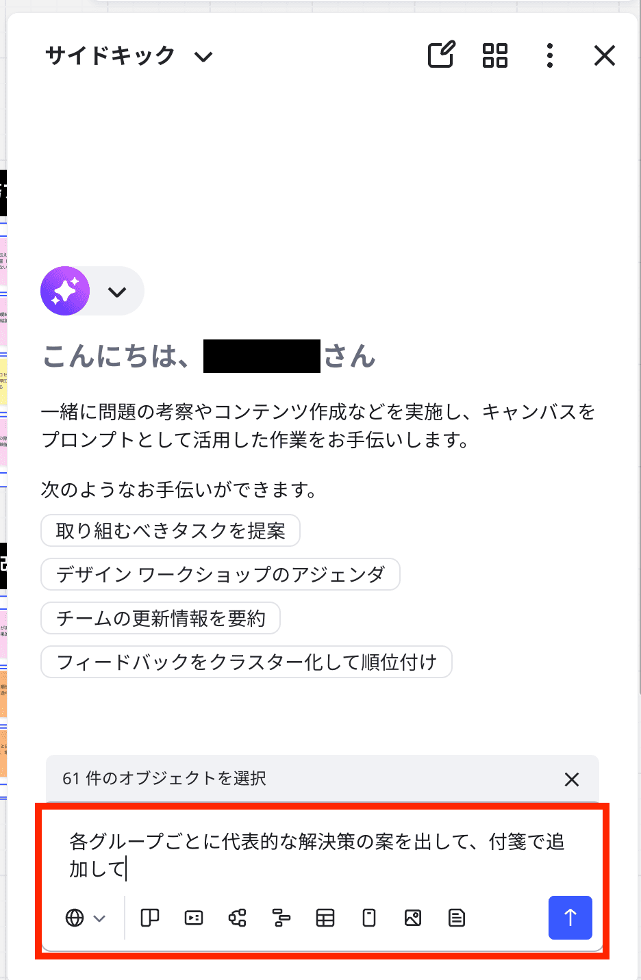 グルーピングした付箋を選択し、左側のメニューにある星型のアイコンをクリックし、Sidekicksを起動します。