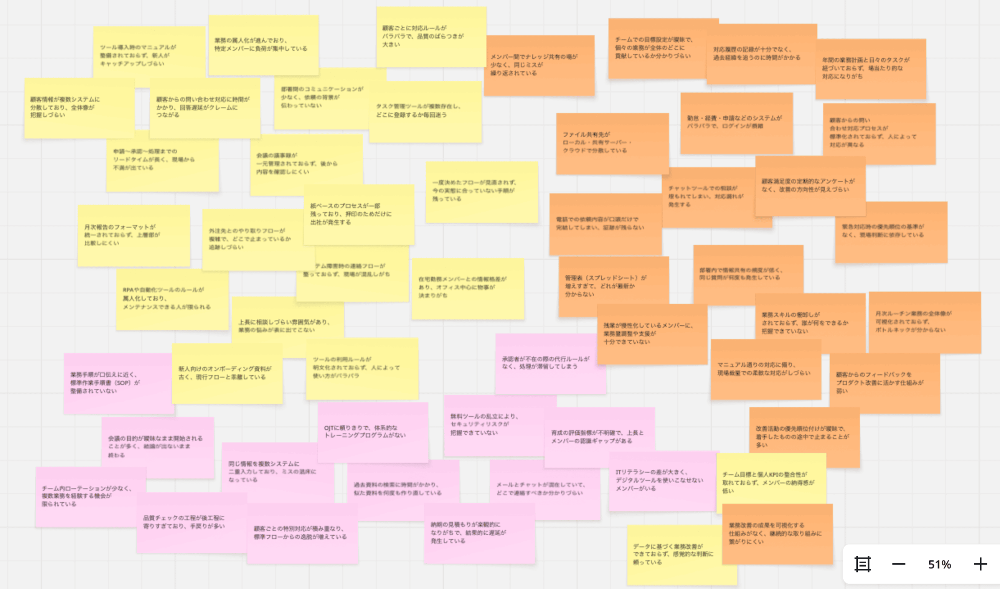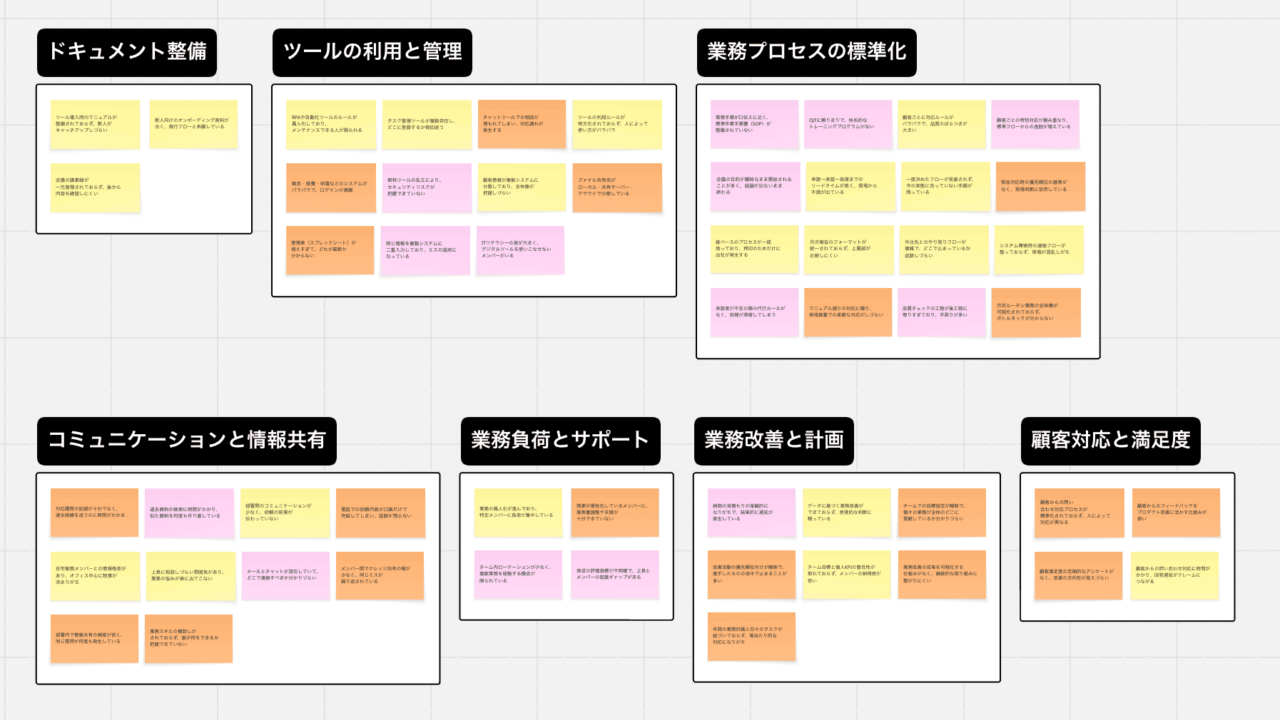 「ドキュメント整備」「ツールの利用と管理」「業務改善と計画」など、論点ごとに整理されており、付箋の内容との整合性が高い仕上がりでした。