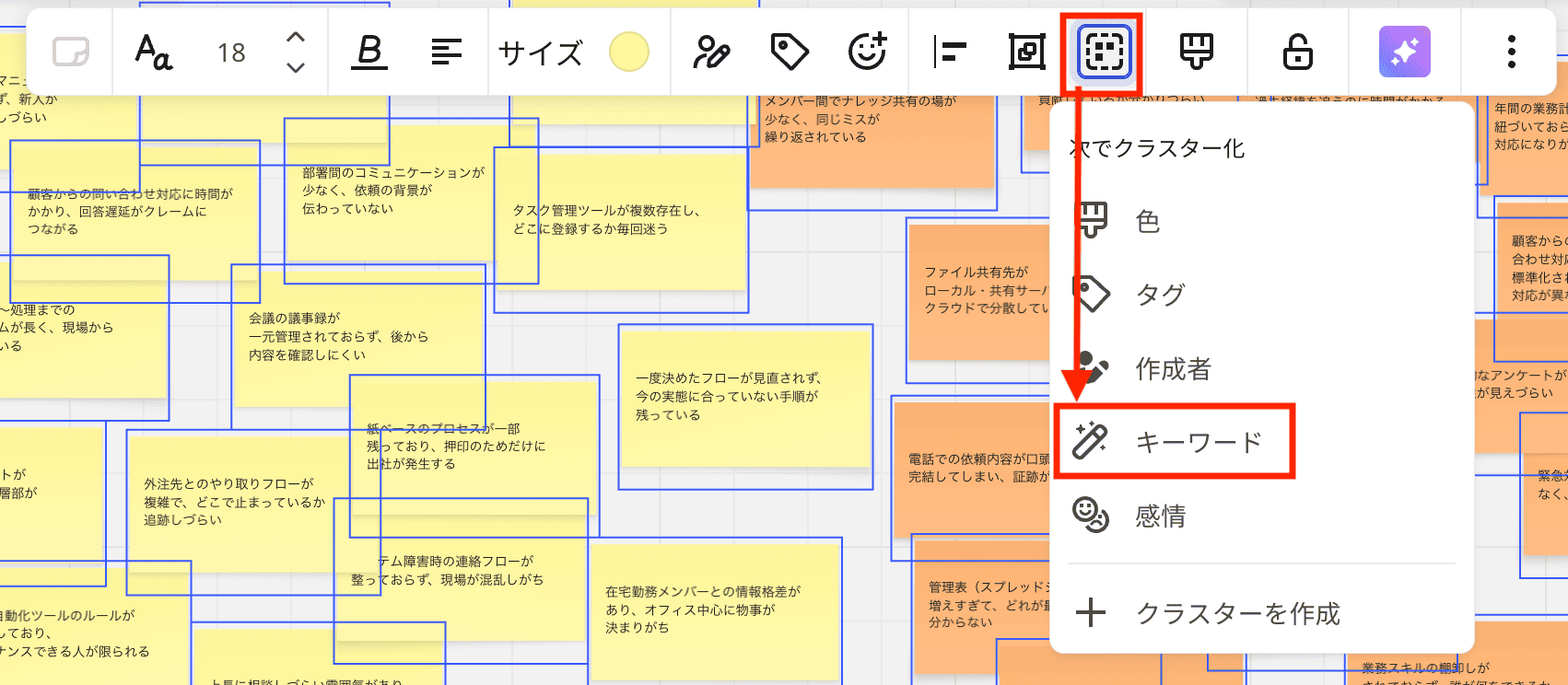 すべての付箋を選択後、メニューから「クラスター化」→「キーワード」をクリックします。