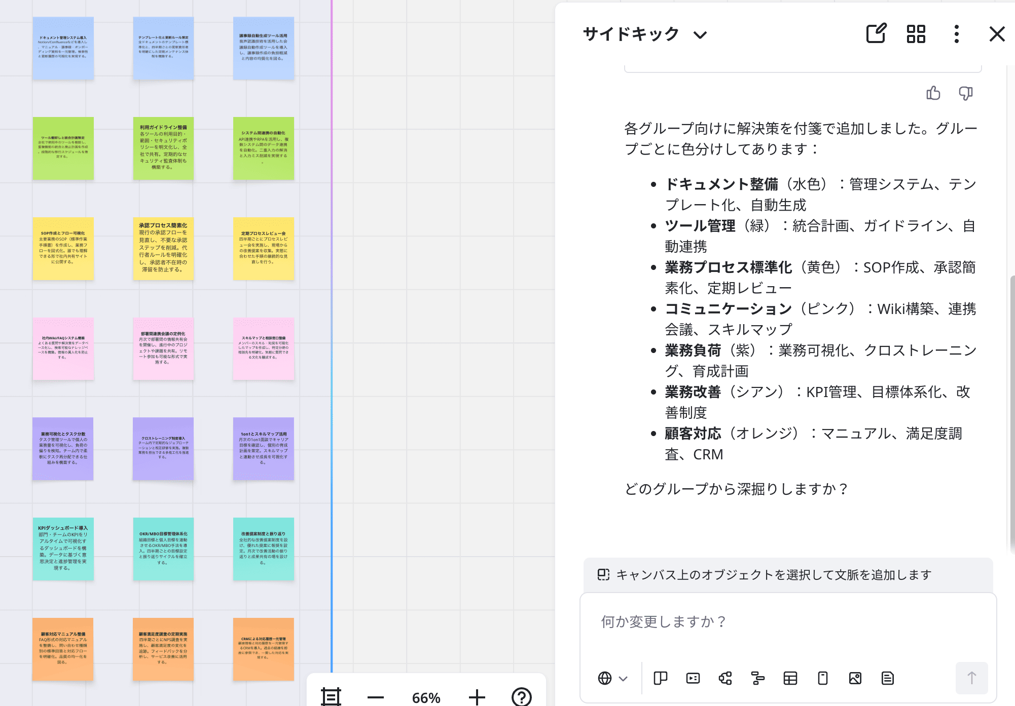 Sidekicksで追加された解決策の付箋はグループごとに色分けされており、パッと見ただけでどのグループに属する内容かが判別しやすくなっています。