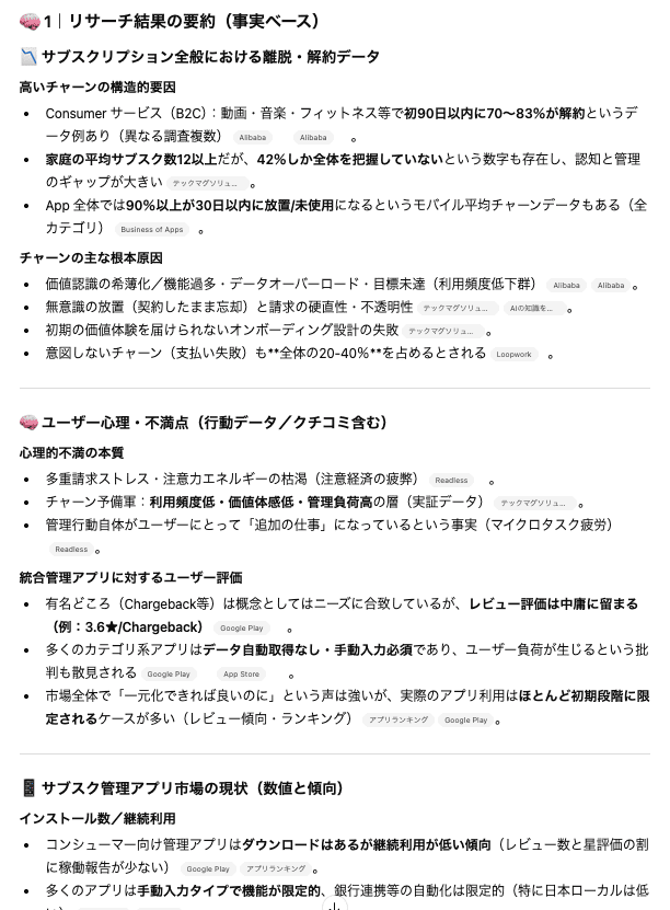 一方で、ユーザーインサイトの裏付けやリスク整理は手薄な印象でした。回答はあくまでたたき台として捉え、一次情報との照合や実行フェーズの検証は別途行うのが現実的です。
