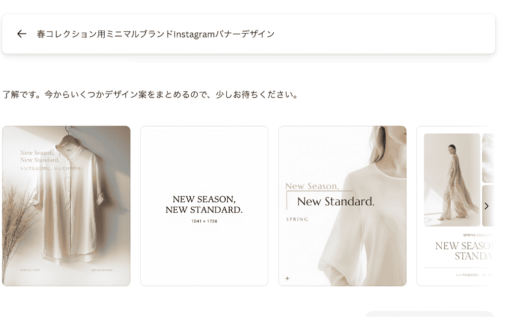 上記のテキストのみを投稿したところ、AIが瞬時に指示した画像のイメージやメッセージに合わせて、最適なレイアウトとフォントを組み合わせたデザイン案を4つ生成してくれました。