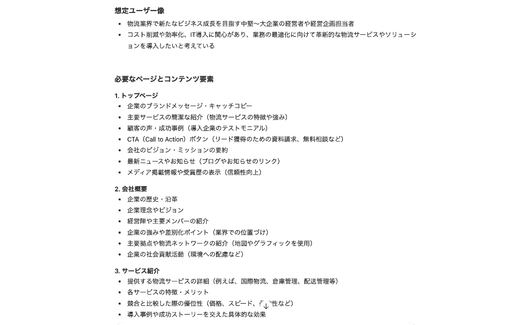 さらに各ページにどのようなコンテンツを配置すべきか、論理的に整理されたリストが出力されるため、構成を考える時間が大幅に短縮。