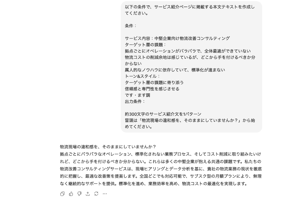 今回は実際に、新規コーポレートサイトの構成案とキャッチコピーの作成をChatGPTに依頼してみました。