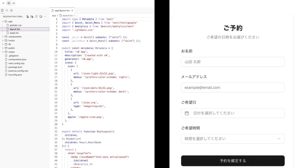 最後に、デザインからコーディングへの橋渡しをスムーズにするツールとして、Vercelが提供する「v0」でUI構築を試してみました。
