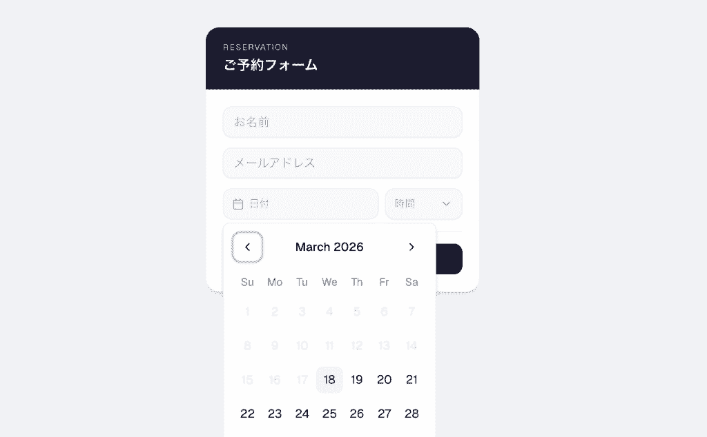 モダンでクリーンなデザインの予約フォームUIコンポーネントを作成してください。