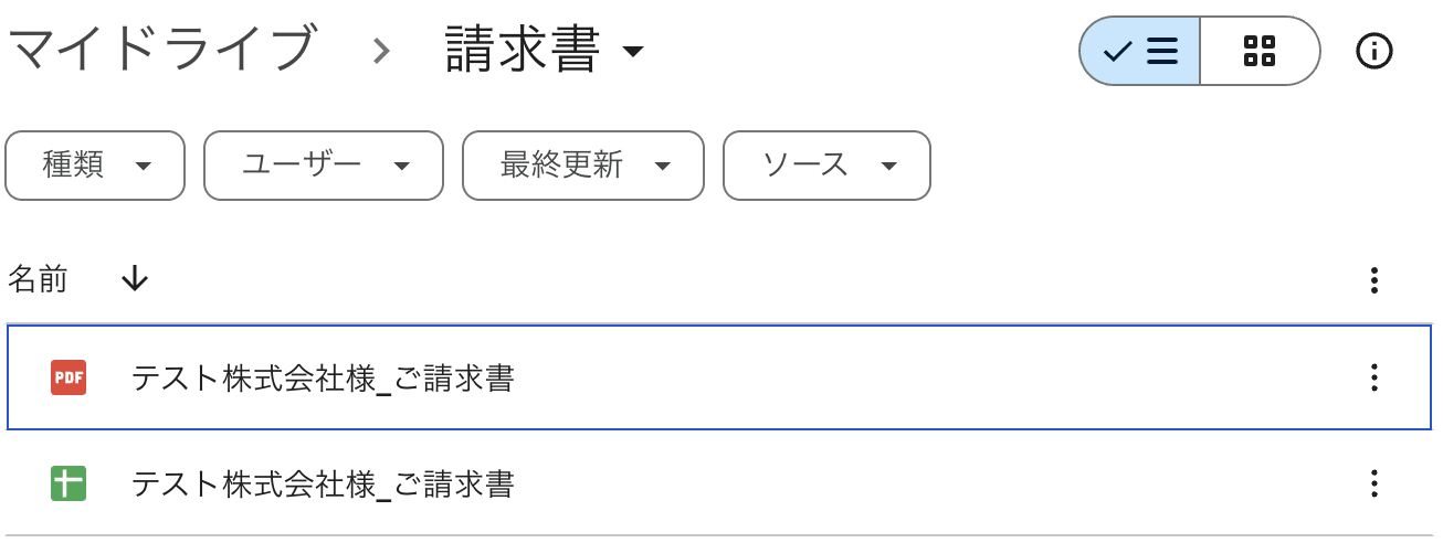 設定完了後は「テスト」をクリックして、作成された請求書が指定したGoogle Driveに格納されていることを確認しましょう。