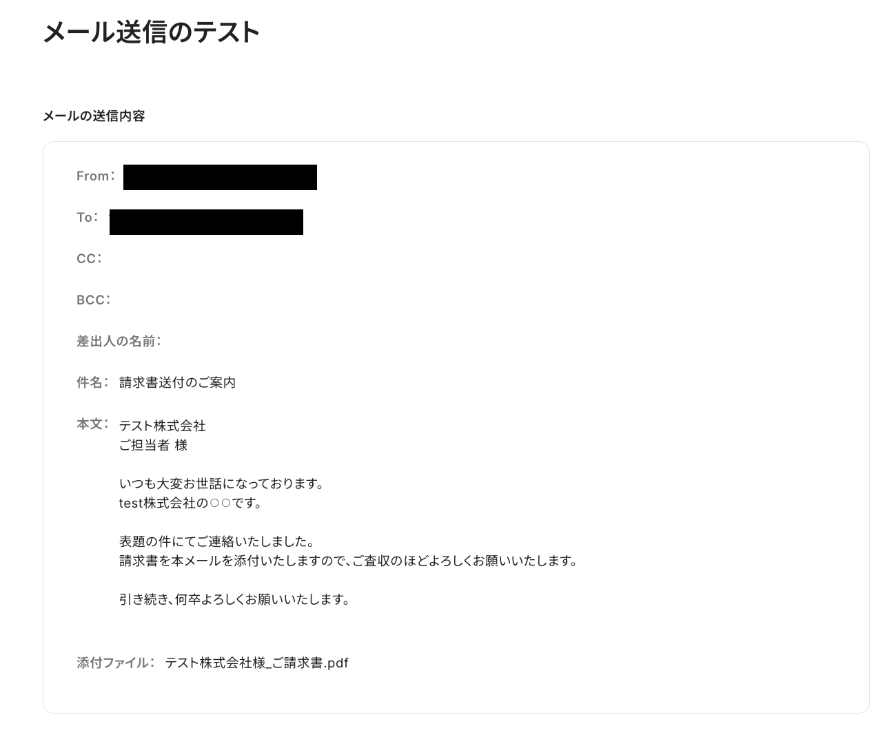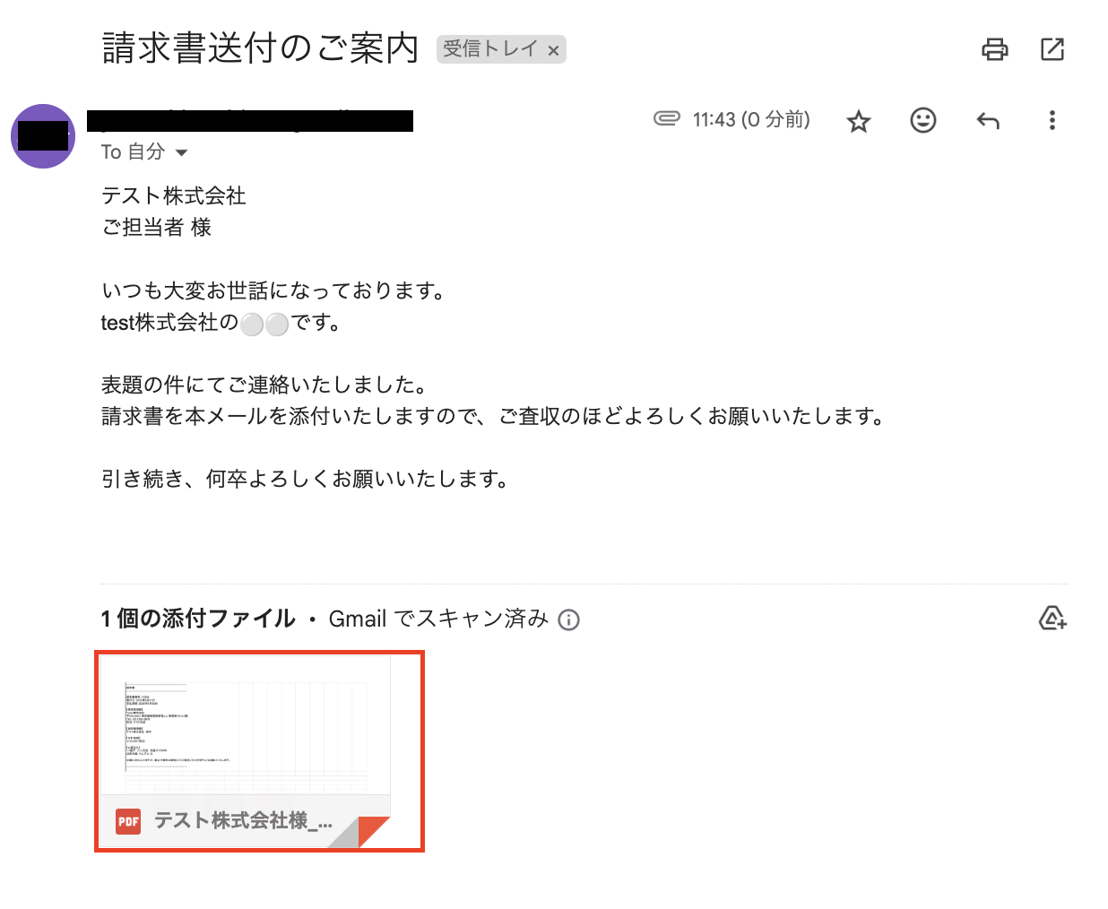 自動作成した請求書が添付された状態で、設定したメッセージの通りにメールが届いていましたよ!