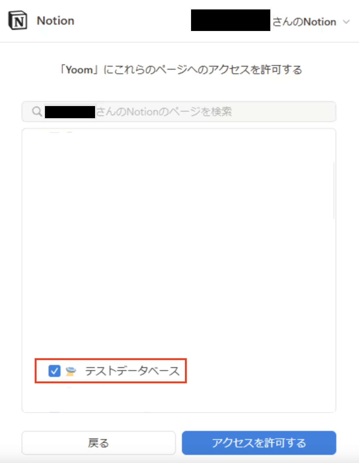 Notionで作成済みのページ一覧が表示されるので、フローで使用するページにチェックを入れ、「アクセスを許可する」をクリックして連携完了です!