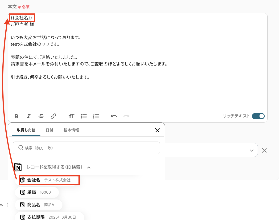 「お世話になっております」など毎回使用する定型的な文章は直接手入力し、「会社名」などNotionの情報を引用する部分は『取得した値』を用いて設定してくださいね!