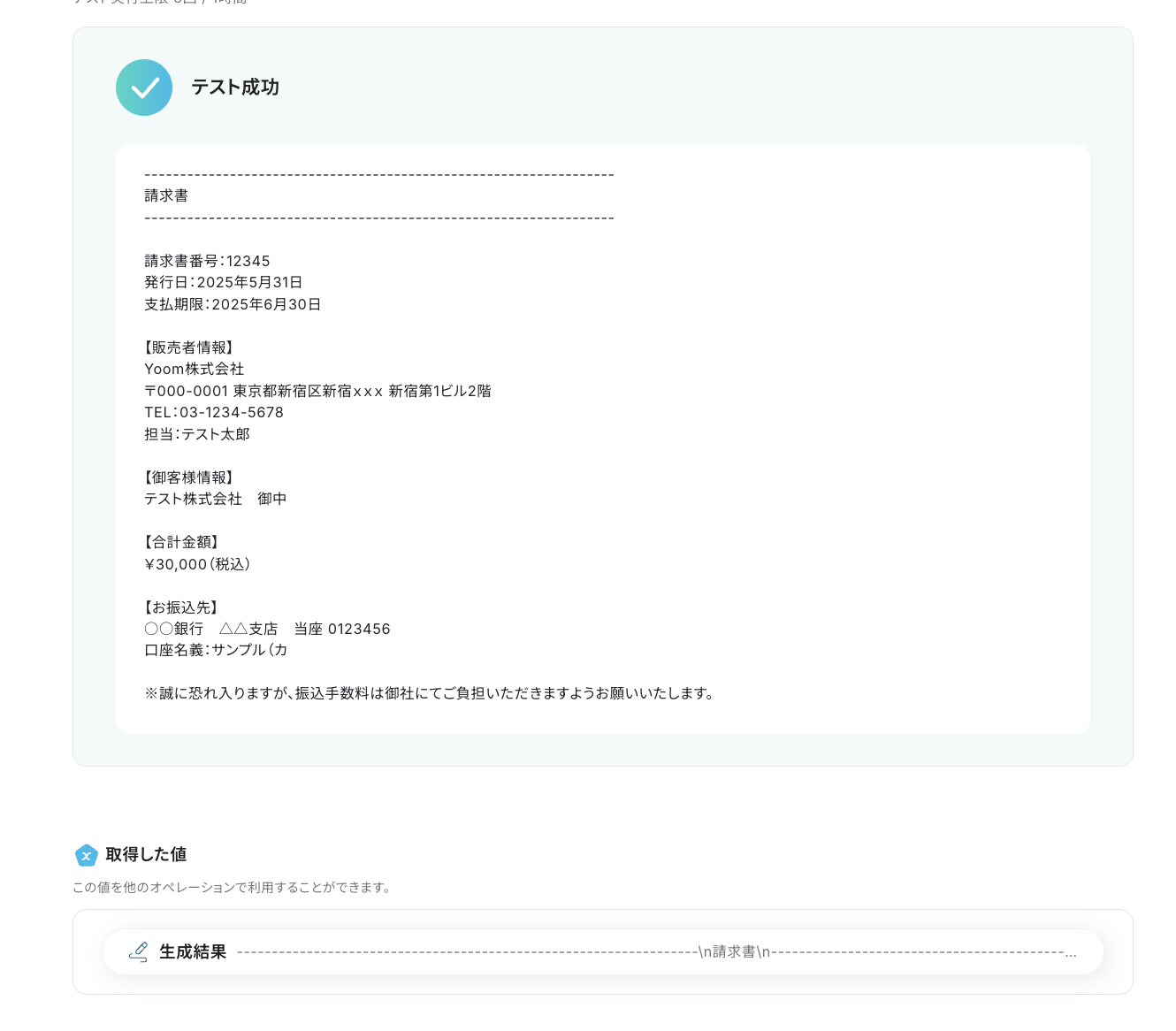 設定が完了したら「テスト」をクリックし、レコードの情報に基づいたテキストが生成されることを確認しましょう。